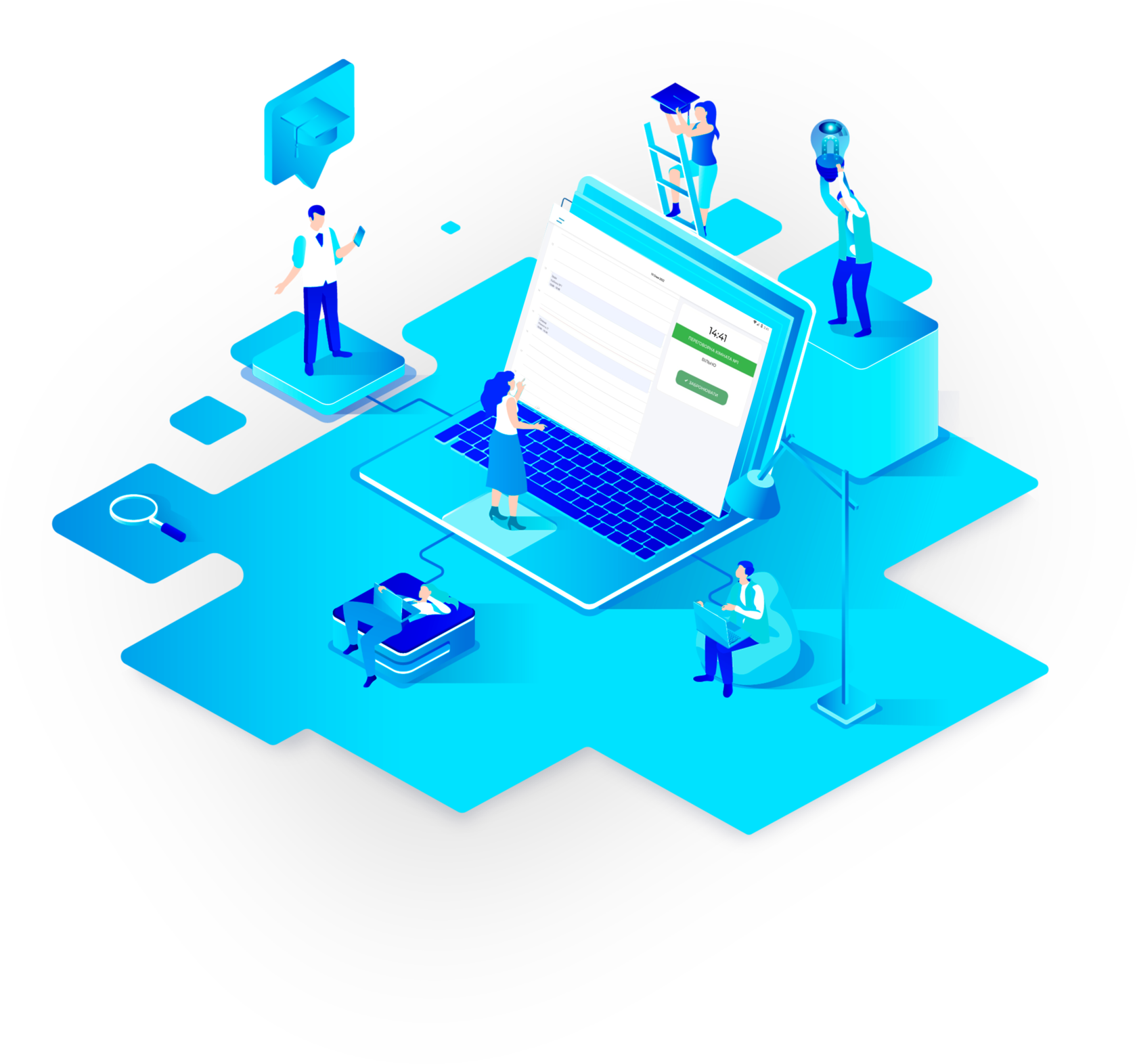 This is a web application or mobile app that allows users to see the availability of free spaces for collaboration and independently book online office cubicles, conference rooms, and other meeting spaces.
