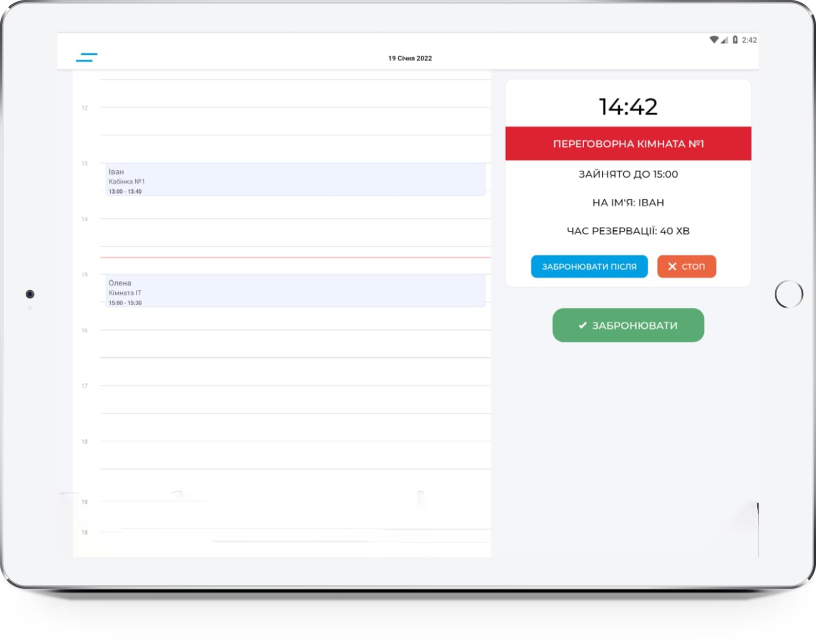 The software is installed in tablets located near the meeting rooms. This internally sophisticated advanced booking system with a number of intelligent features is simple and easy to use. The main page displays a timeline with slots, with the current booking on the right. Each user can log in with a login and password.